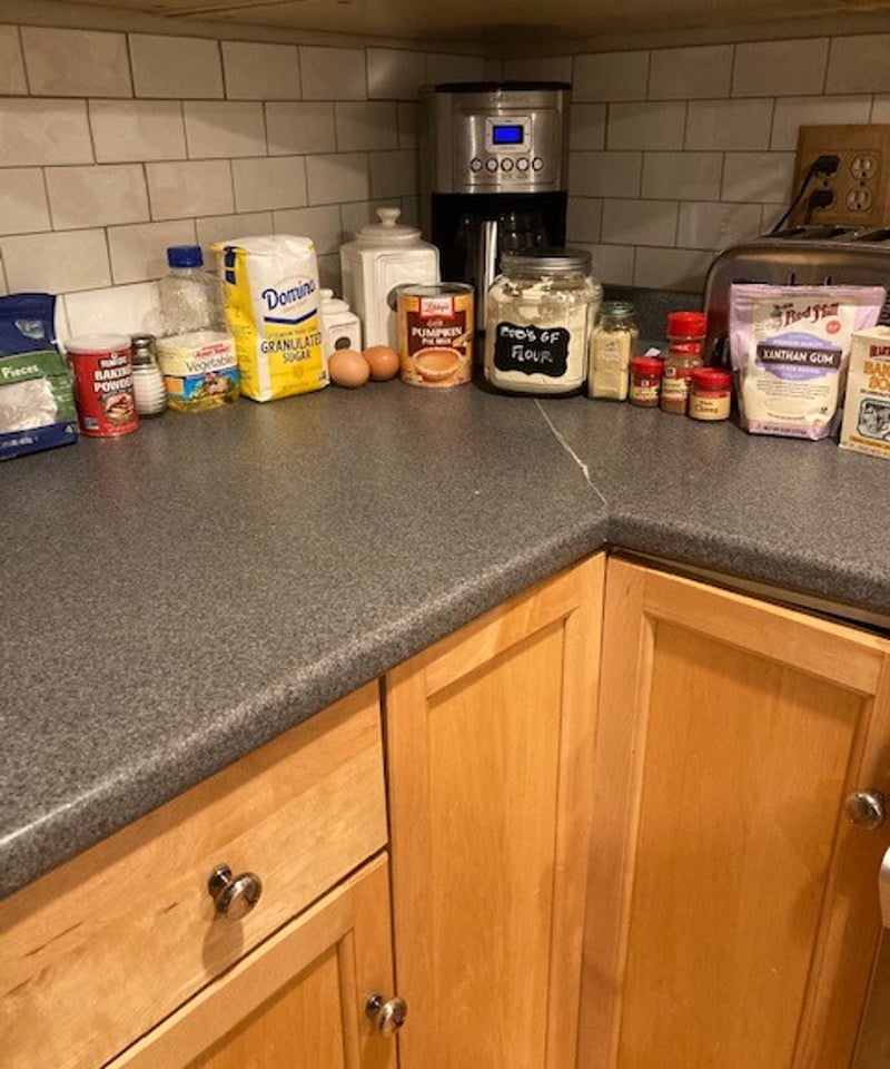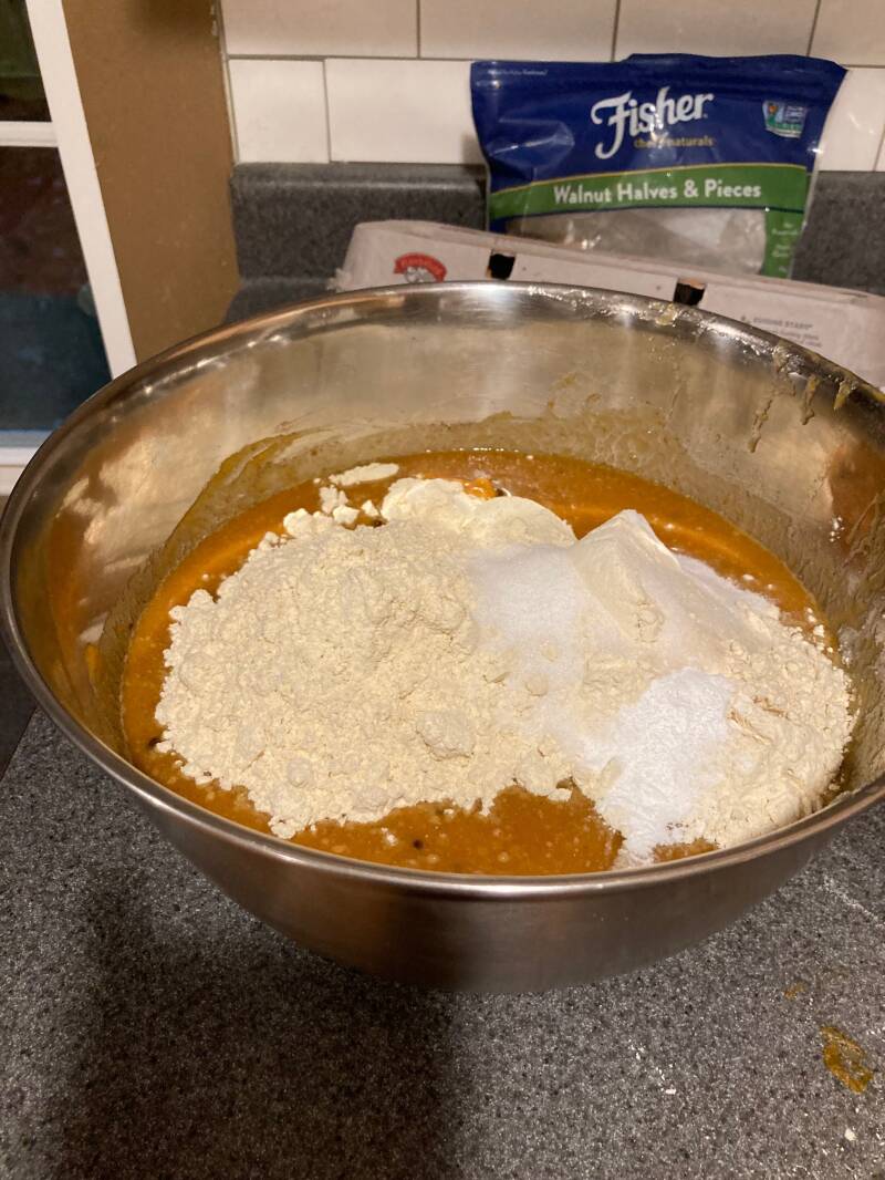 For this recipe you will need the following: sugar, vegitable oil, eggs, water, pumpkin puree, ground ginger, ground allspice, ground cinnamon, ground cloves, gluten free flour mix, xanthem gum, baking soda, salt, baking powder and walnuts.
