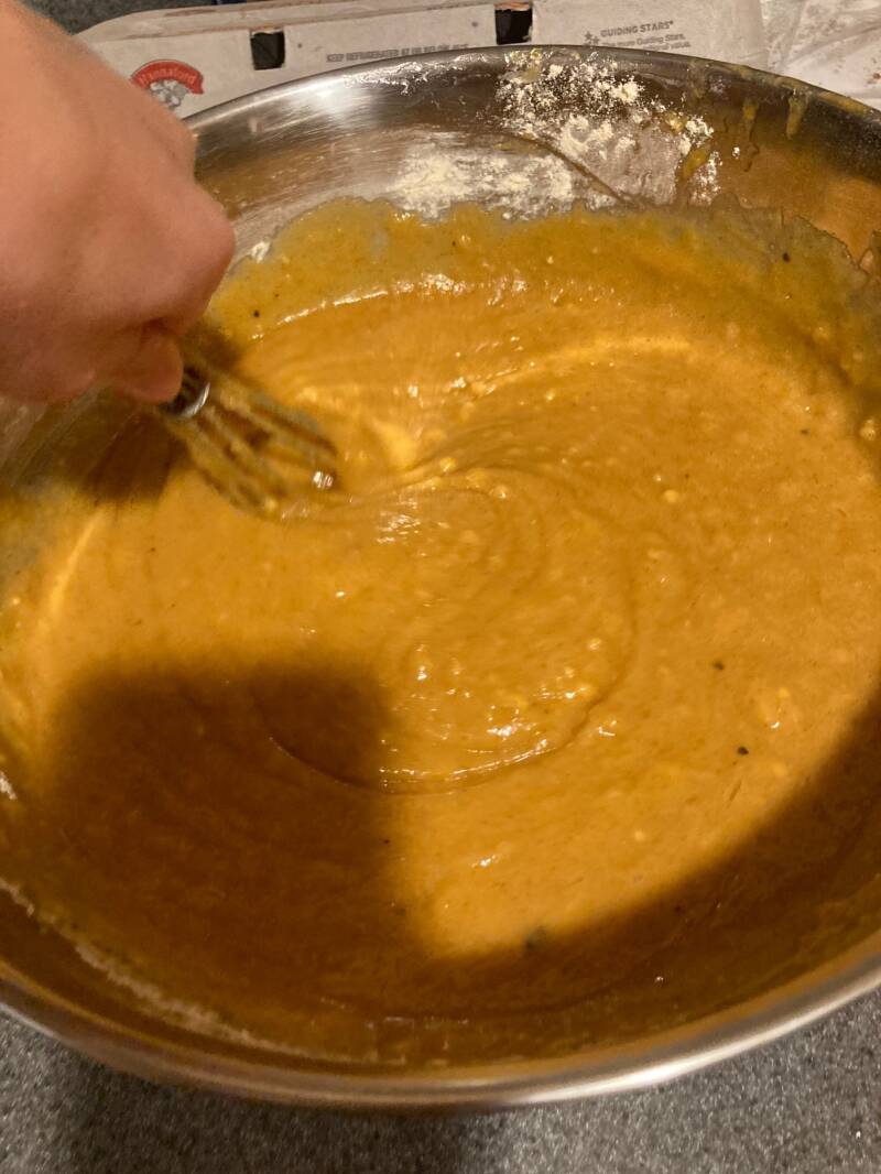 3. In a medium sized bowl, combine flour, Xanthan gum, baking soda, salt, and baking powder. Add dry ingredients to the pumpkin mixture and stir just until all of the ingredients are mixed. Pour the batter into the loaf pan that we have pre-prepared.